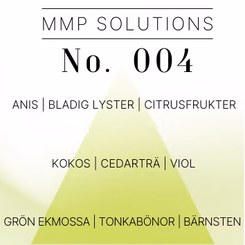MMP No. 004 är en frisk men samtidigt djup doft framtagen för varumärken som vill arbeta med ett naturligt, modernt och sofistikerat uttryck. Doften har en tydlig grön karaktär i öppningen och utvecklas successivt mot ett mjukt träigt och varmt avslut, vilket gör den särskilt lämpad för professionell försäljning och långsiktigt sortiment.
